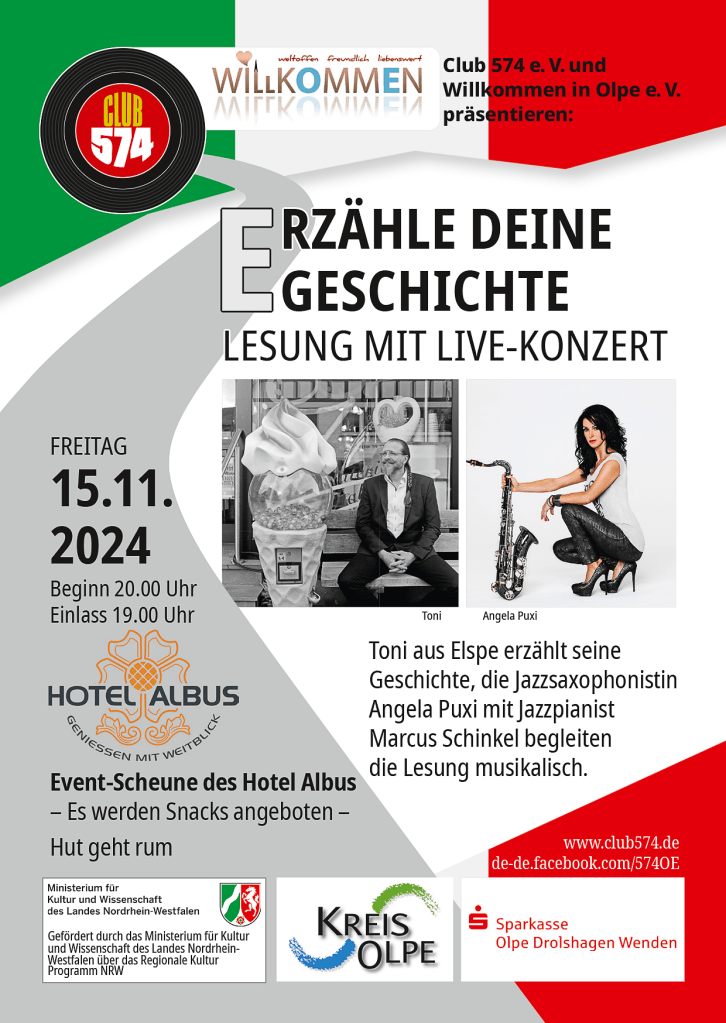 Die Lesung mit Musik ist eine Kooperation des „Club 574“, der sich als eingetragener Verein als Katalysator einer freien künstlerischen und musikalischen Szene jenseits des „Mainstream“ versteht und an wechselnden Orten und Locations Kulturevents in der Region veranstaltet – unter anderem im Rahmen des aktuell geförderten Projekts „Kulturnomaden“, und des Vereins „Willkommen in Olpe“, der sich für eine offene und bunte Gesellschaft einsetzt und Träger des Projekts „Erzähle Deine Geschichte“ ist.