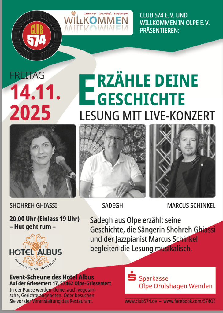 Von Menschen, die aus den verschiedensten Ländern der Welt nach Südwestfalen gezogen sind, handelt das Projekt „Erzähle Deine Geschichte“. Am Freitag, 14. November 2025, findet dazu im Hotel Albus in Olpe die inzwischen dritte Lesung mit Musik statt, die der Club 574 und der Verein „Willkommen in Olpe“ gemeinsam präsentieren. Der Eintritt ist kostenlos.